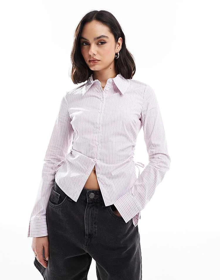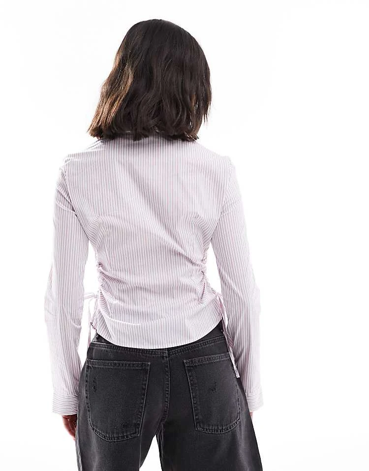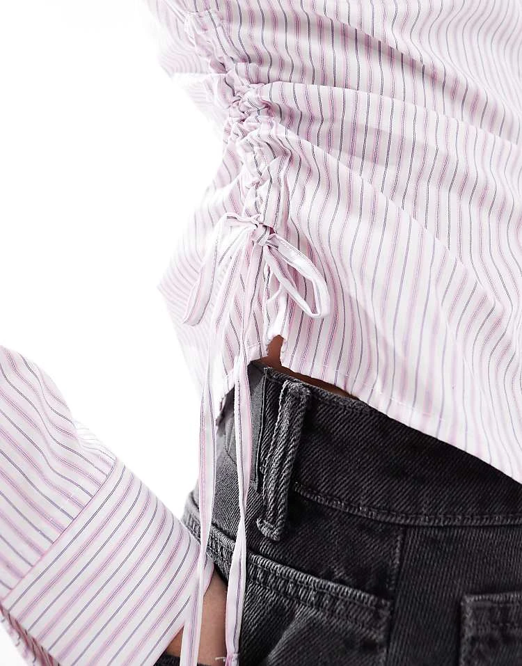 Bershka Tie Waist Wide Leg Linen Trousers In Ecru Stripe For Women