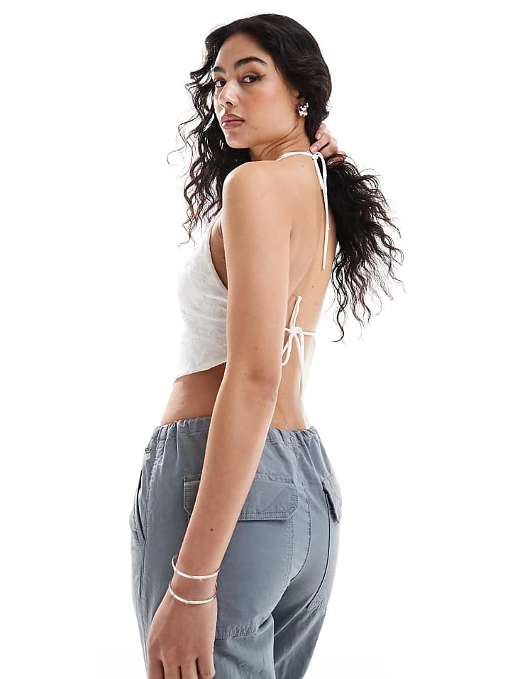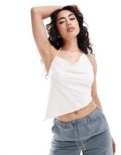 Bershka Tie Waist Wide Leg Linen Trousers In Ecru Stripe For Women