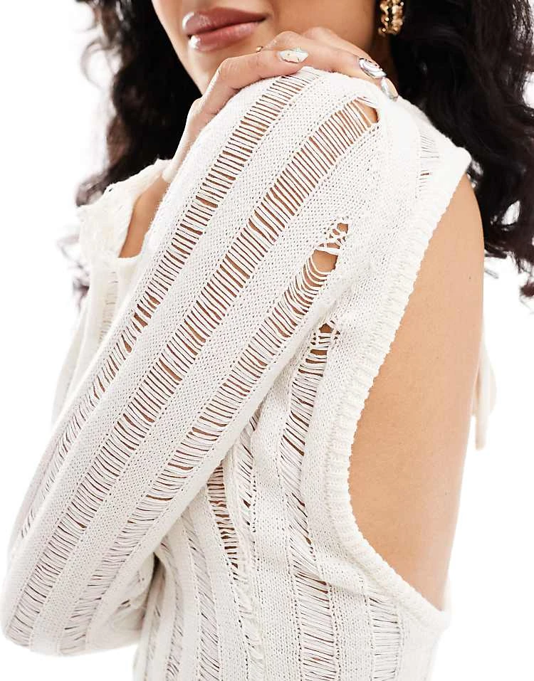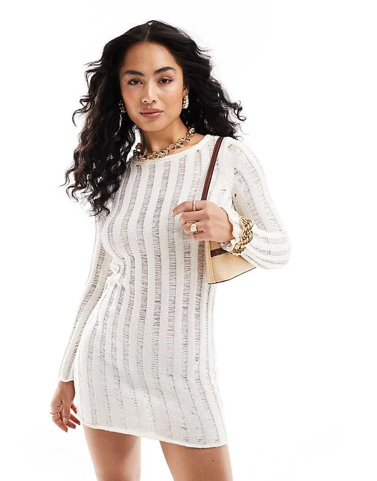 Bershka Tie Waist Wide Leg Linen Trousers In Ecru Stripe For Women