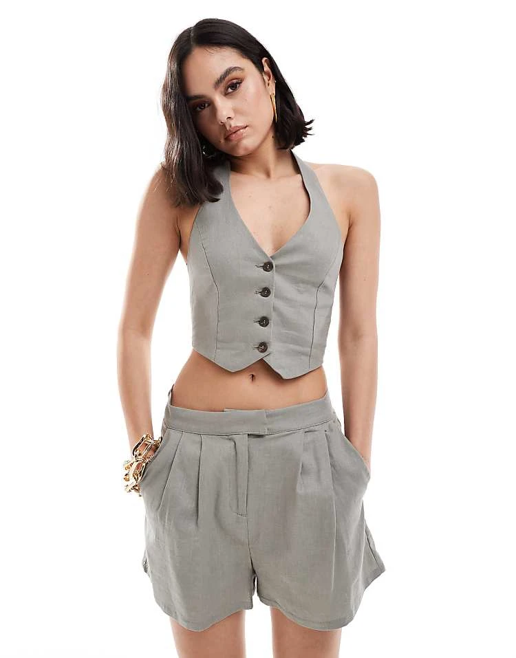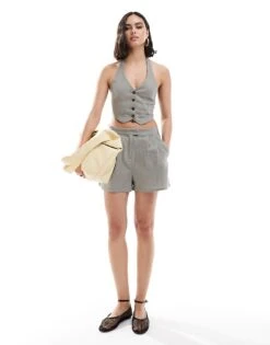 Bershka Tie Waist Wide Leg Linen Trousers In Ecru Stripe For Women