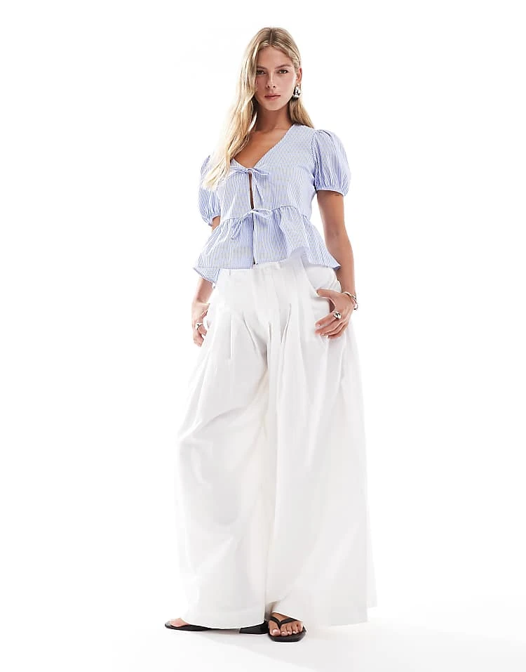 Bershka Tie Waist Wide Leg Linen Trousers In Ecru Stripe For Women