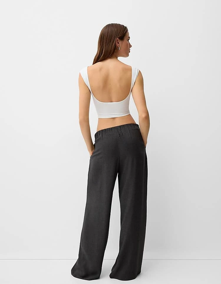 Bershka Crinkle Wide Leg Trousers And Tie Back Shirt Co-ord In Brown