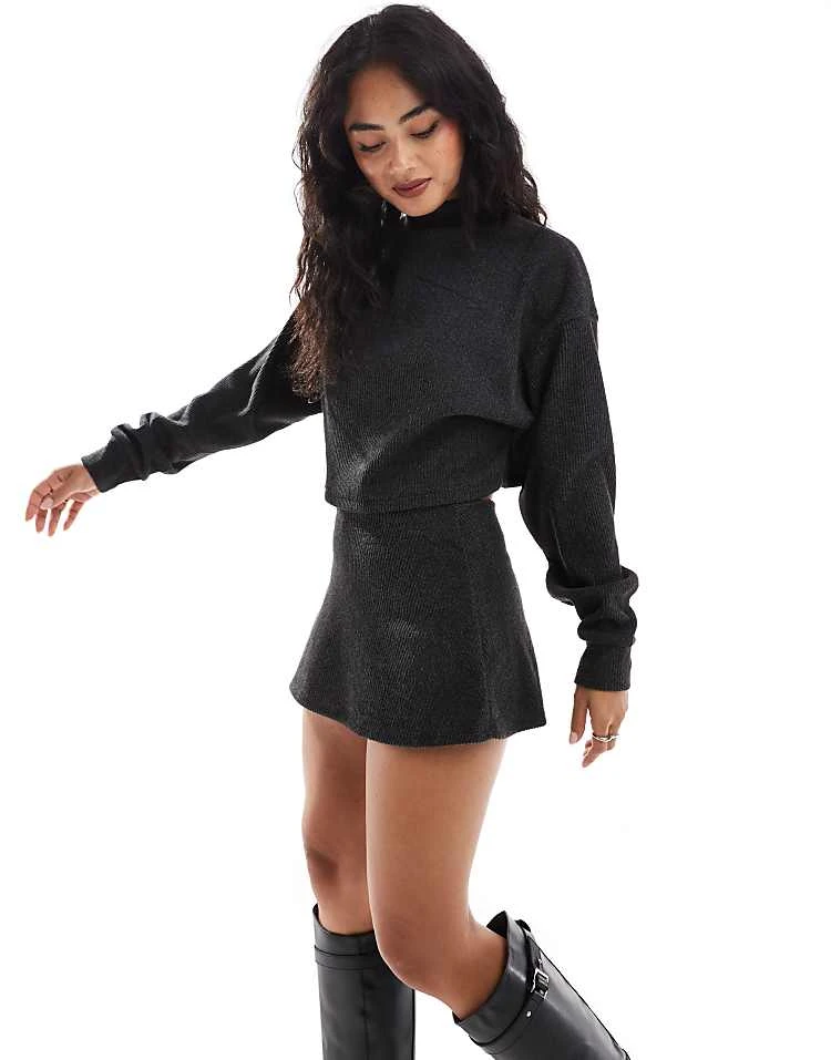 Bershka Soft Touch High Neck Top And Trousers Co-ord In Dark Grey