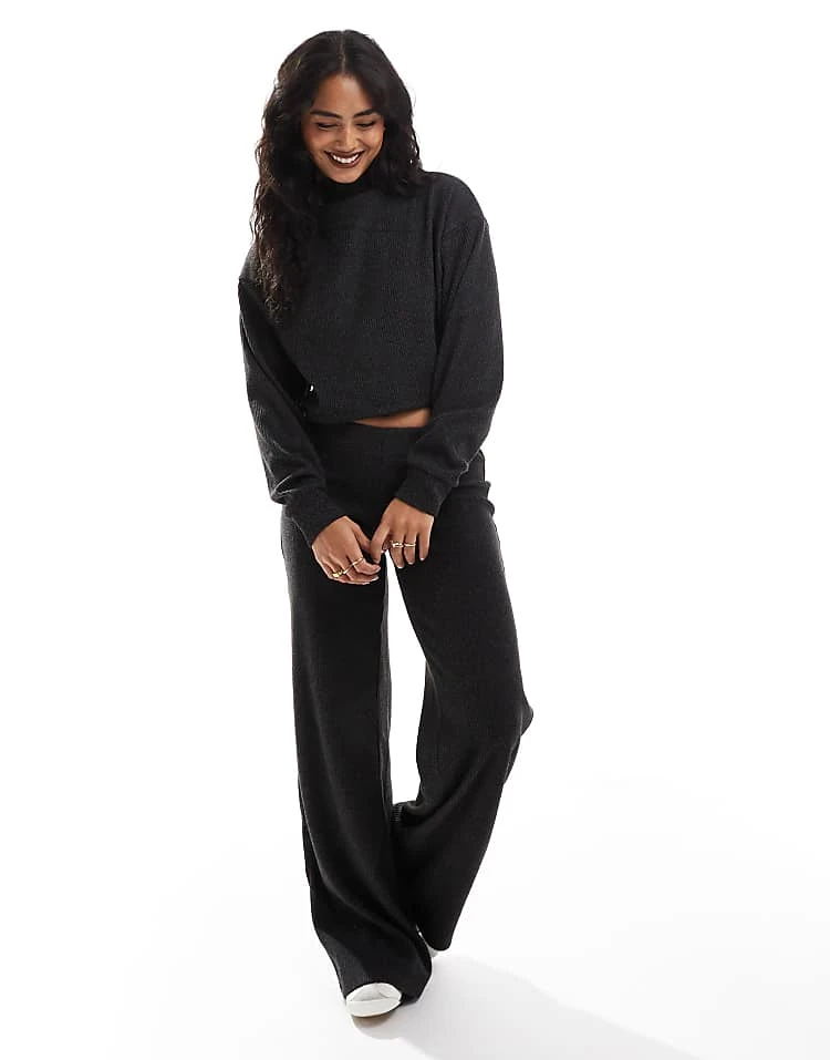 Bershka Soft Touch High Neck Top And Trousers Co-ord In Dark Grey