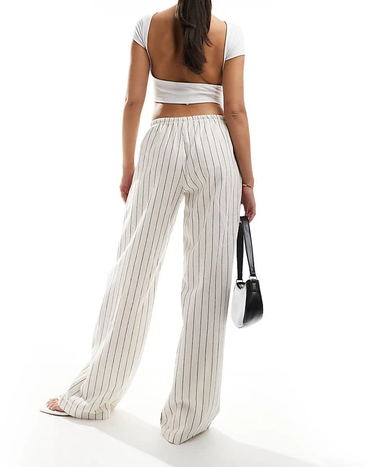 Bershka Tie Waist Wide Leg Linen Trousers In White For Women