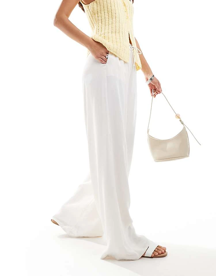 Bershka Tie Waist Wide Leg Linen Trousers In White For Women