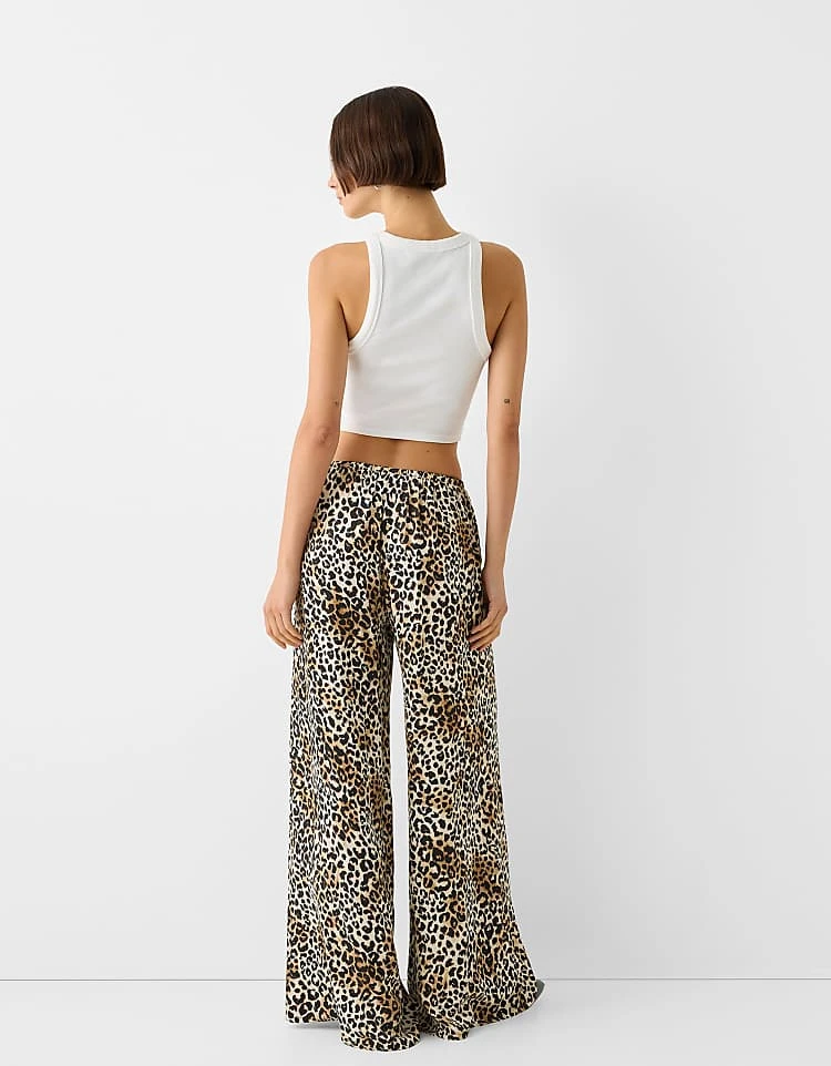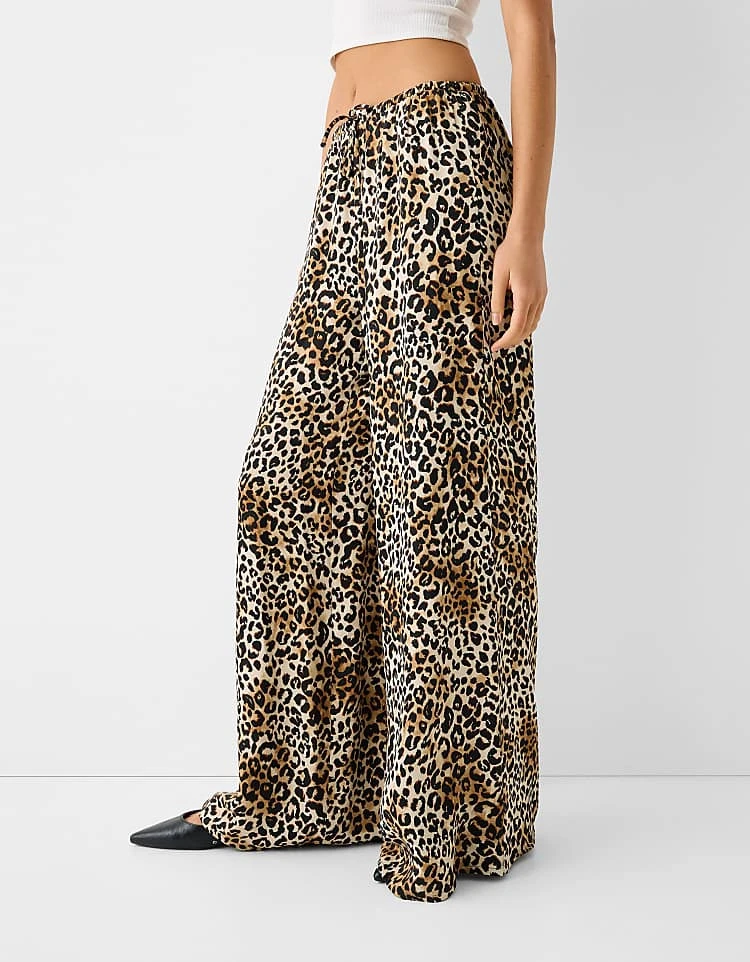 Bershka Tie Waist Wide Leg Linen Trousers In Brown For Women