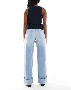 Bershka Wide Leg Baggy Jeans In Dirty Mid Blue Wash For Women